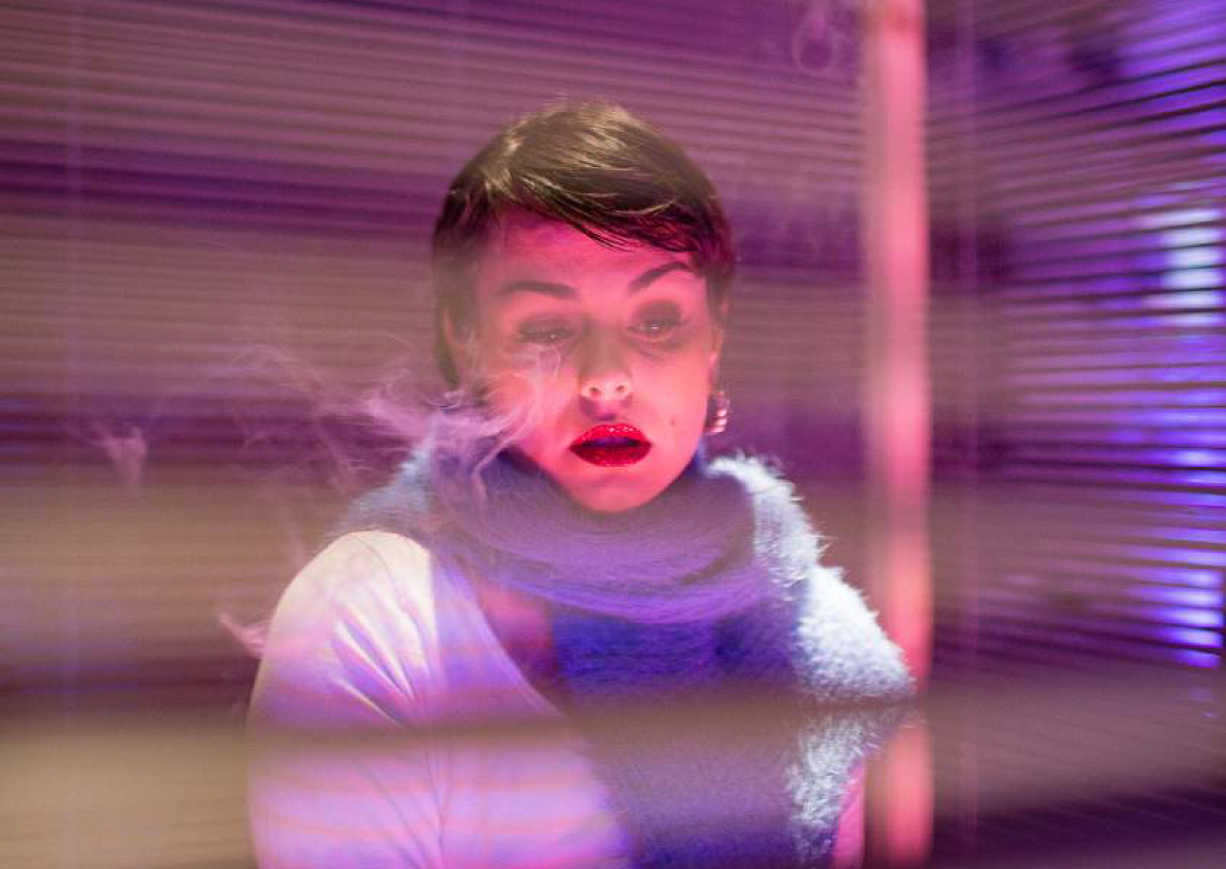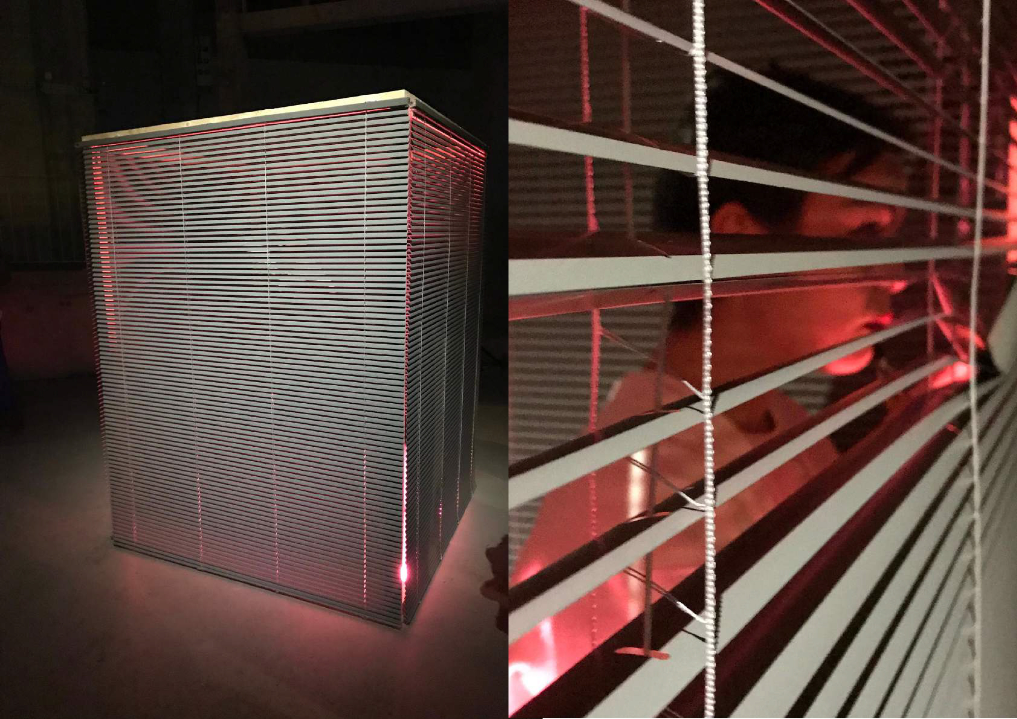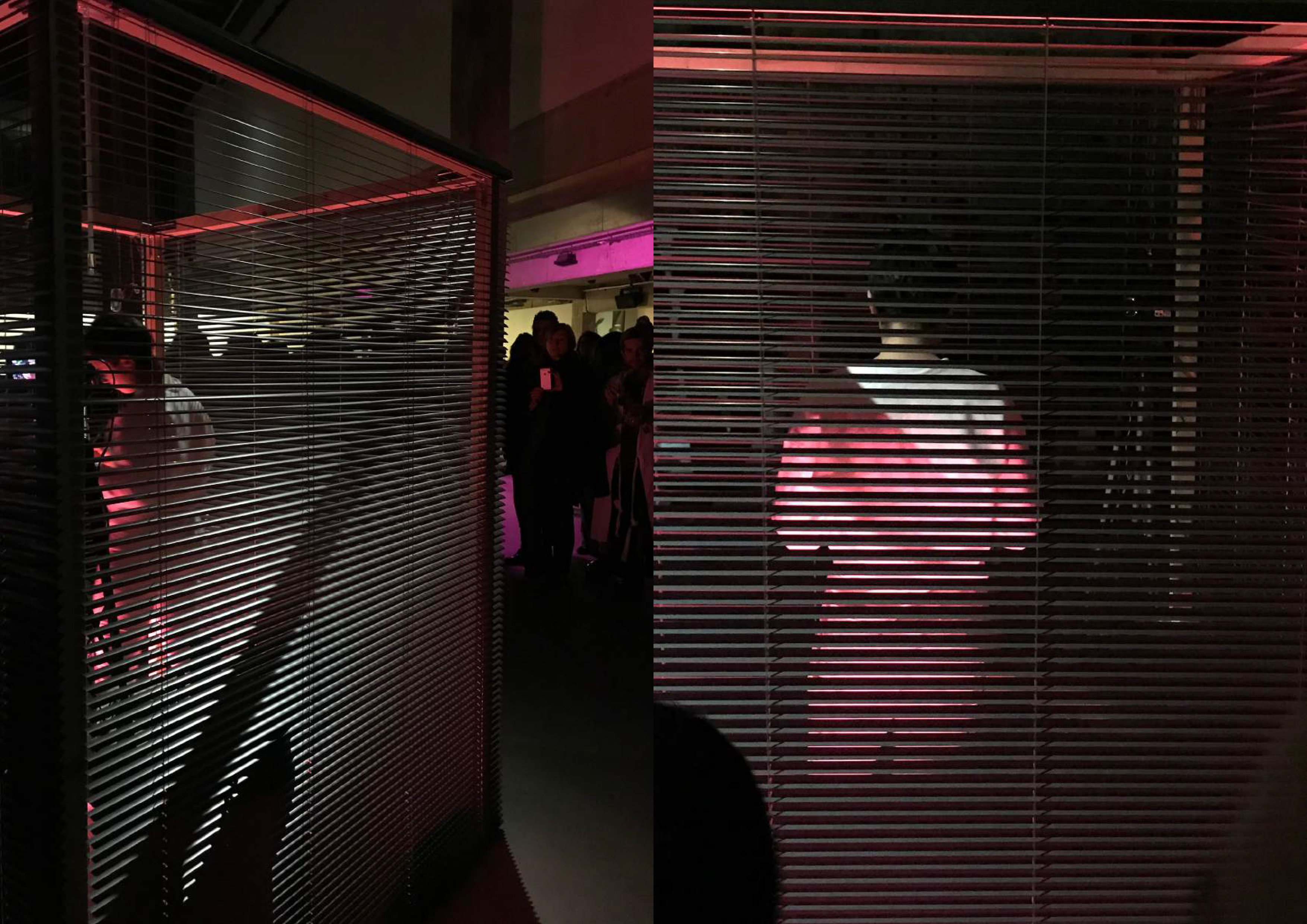 « On distingue une silhouette féminine dans une ‘cage’ de stores. Espace privé dans l’espace public, ici le spectateur devient voyeur malgré lui. Ouverture et fermeture des lattes d’aluminium, elle nous force à l’observer. Self made gourou de la beauté mais impératrice banale du web, Narcisse féminine 2.0 dont le spectateur est le miroir. Ce personnage désincarné joue avec les codes en ligne et hors ligne et les espaces d’interactions qu’ils créent. »