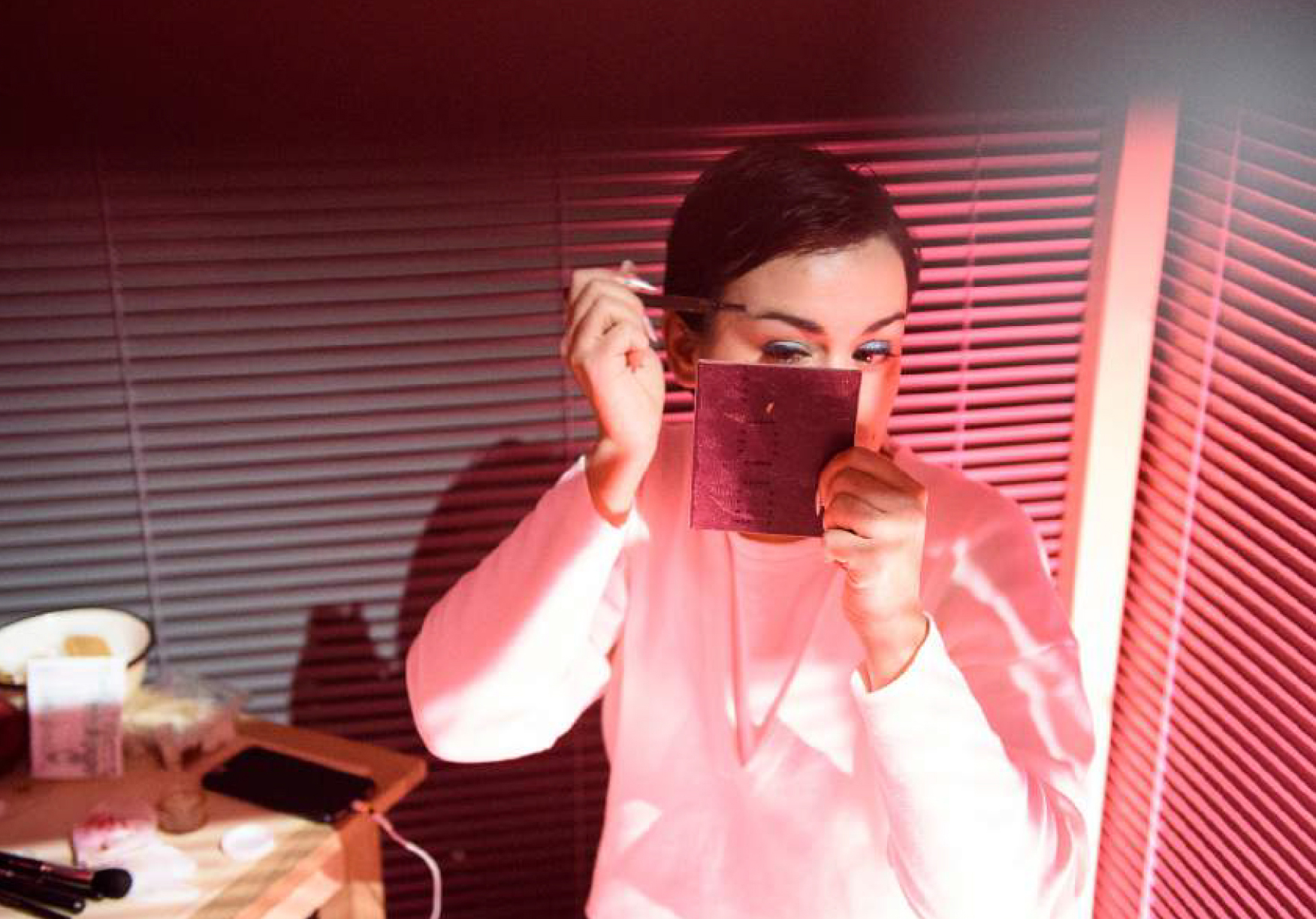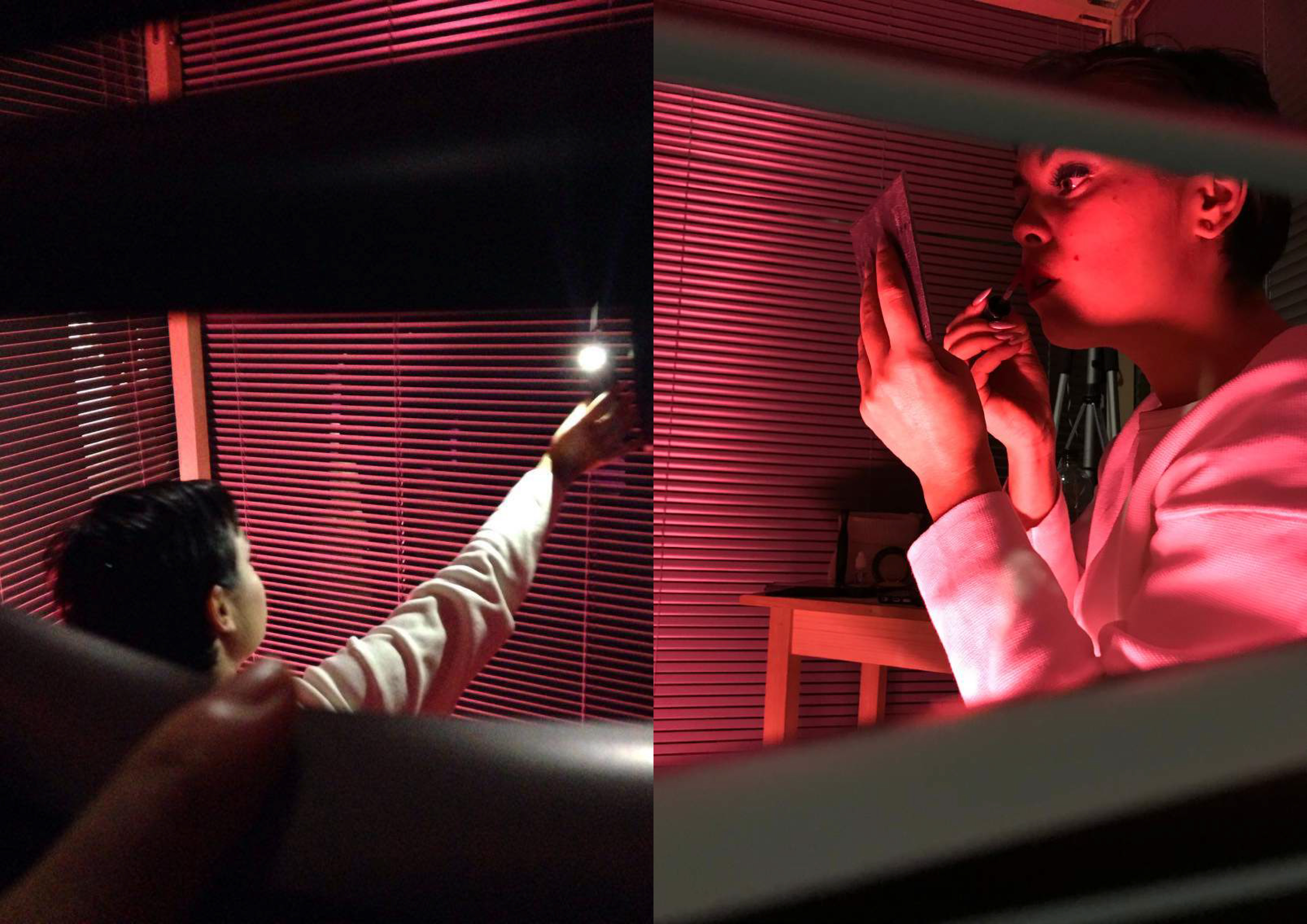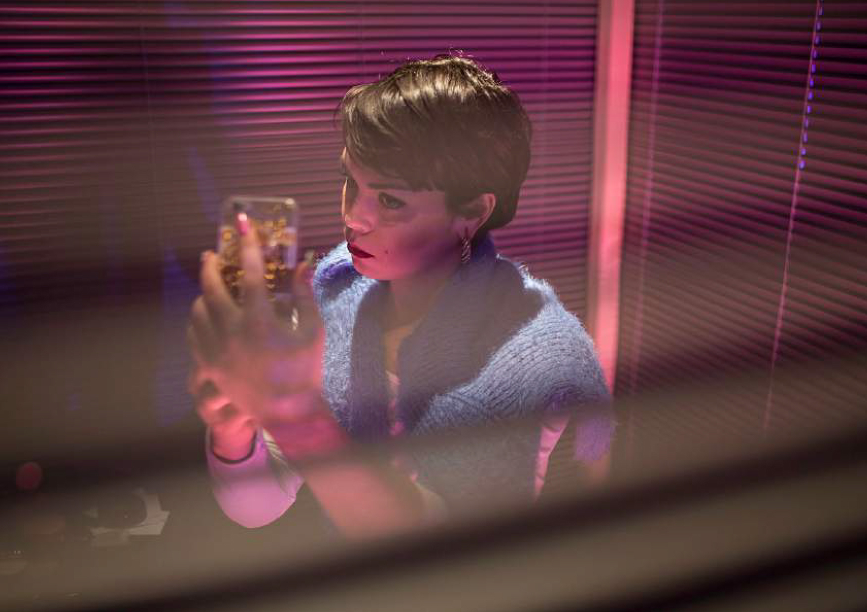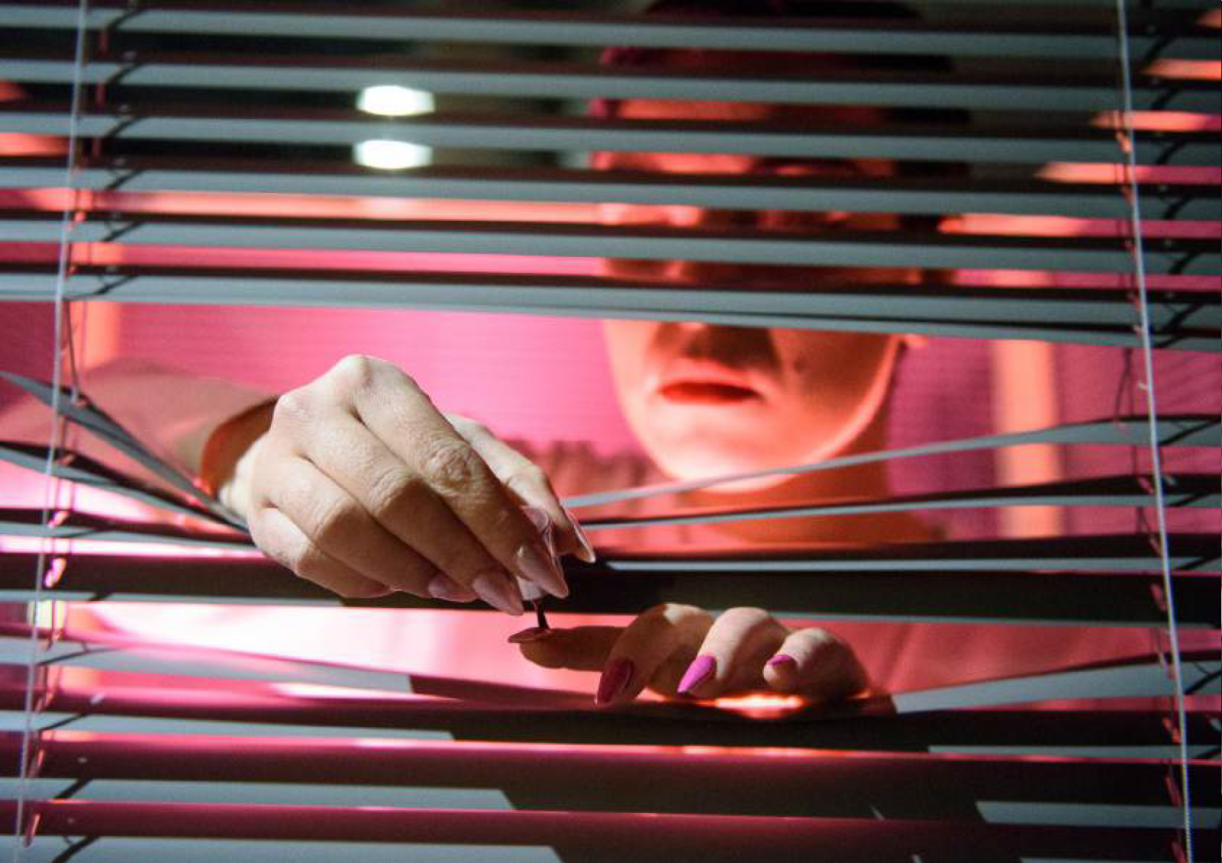 « On distingue une silhouette féminine dans une ‘cage’ de stores. Espace privé dans l’espace public, ici le spectateur devient voyeur malgré lui. Ouverture et fermeture des lattes d’aluminium, elle nous force à l’observer. Self made gourou de la beauté mais impératrice banale du web, Narcisse féminine 2.0 dont le spectateur est le miroir. Ce personnage désincarné joue avec les codes en ligne et hors ligne et les espaces d’interactions qu’ils créent. »